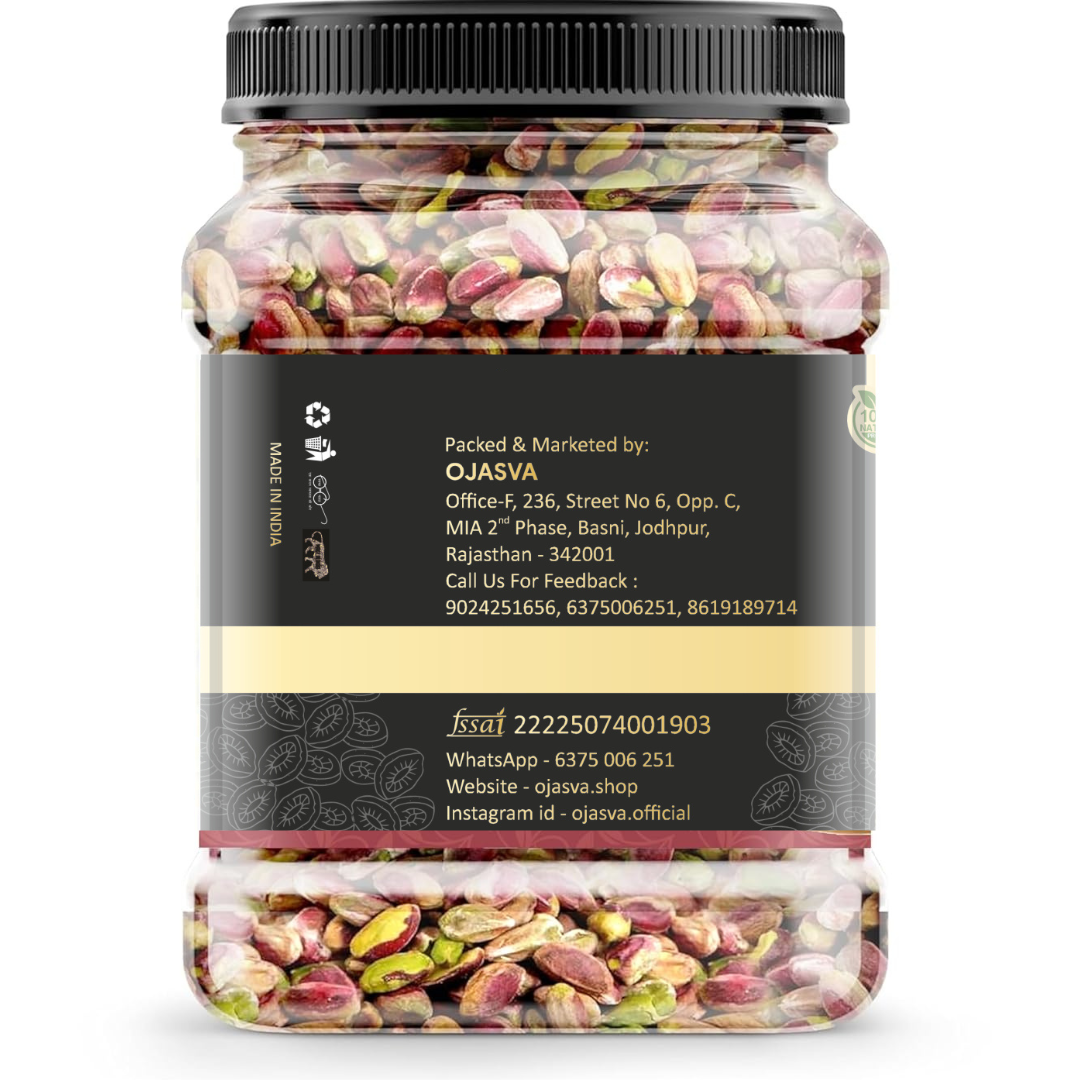 Ojasva Unsalted Pistachio Kernels are a nutritious and wholesome snack, packed with protein, healthy fats, and dietary fibre. These crunchy pistachios are naturally delicious, non-GMO, and free from added salt, making them the perfect guilt-free munch for health-conscious individuals. Enjoy them as a snack, add to desserts, salads, or use in cooking for a rich nutty flavor.