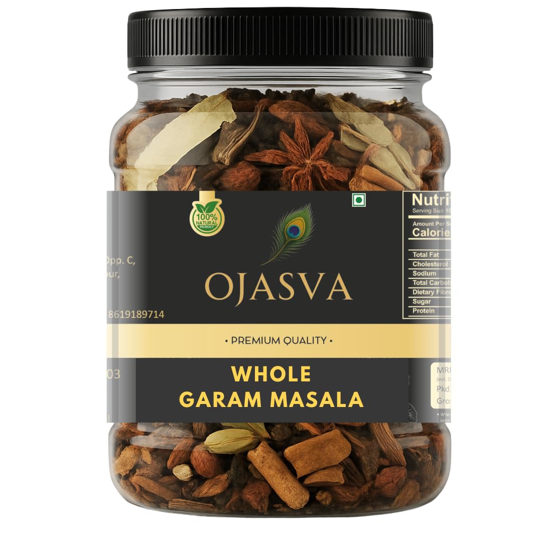 Bring authentic Indian flavor to your kitchen with Ojasva Whole Garam Masala Mix — a carefully curated blend of premium-quality whole spices like clove, black pepper, cardamom, cinnamon, cumin, bay leaves, and more. Perfect for tempering or grinding fresh at home, this whole spice mix enhances the aroma and taste of curries, dals, rice dishes, and gravies. Free from artificial colors or preservatives, this traditional masala offers freshness, purity, and robust flavor in every pinch.